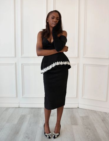 Black velvet peplum dress with off shoulder sleeve and glove.