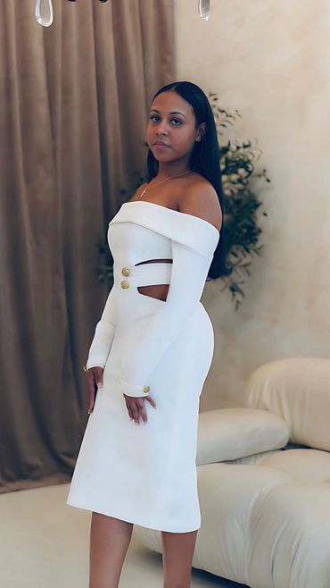off white sheath dress with mesh and strips on the side with gold button. Also come with a cover up top.