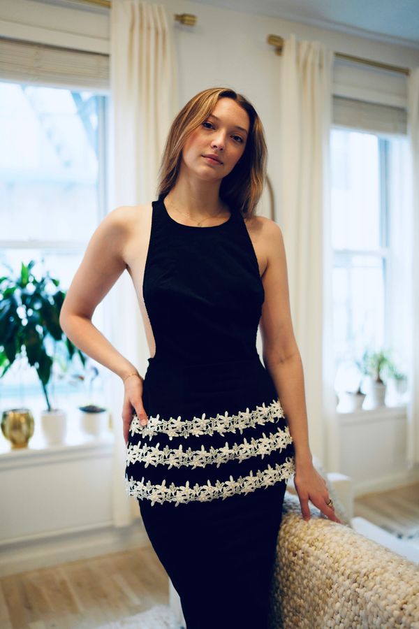 Black velvet dress with deep neckline and floral lace and puffed long sleeves.